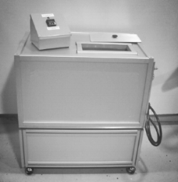 The open tank which contains the test specimens is available in 11-liter or larger sizes. The standard system contains up to 63 Charpy impact test specimens. The Charpy specimen holders can be easily removed and replaced with dynamic tear (DT) specimen holders.