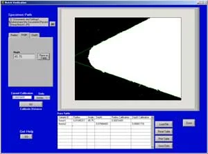 The system can also be used to measure the Charpy notch radius (Figure 9), the notch included angle (Figure 10), and the notch depth (Figure 11). Measurement of Charpy specimen dimensions, such as the notch radius and included angle, requires a telecentric lens and backlighting to achieve high accuracy (Figure 12). In most cases, the notch radius is measured using magnifications ~200X. Lower magnifications are used for the measurement of the notch depth, notch angle, and cross section. The system can be provided with fully automatic measurement and acquisition of key Charpy specimen parameters including notch radius, depth, and angle. The system can be provided with a Charpy-specimen alignment fixture and the software can be used in manual or automatic measurement modes. In automatic mode the notch characteristics can be measured with a single click (Figure 13).